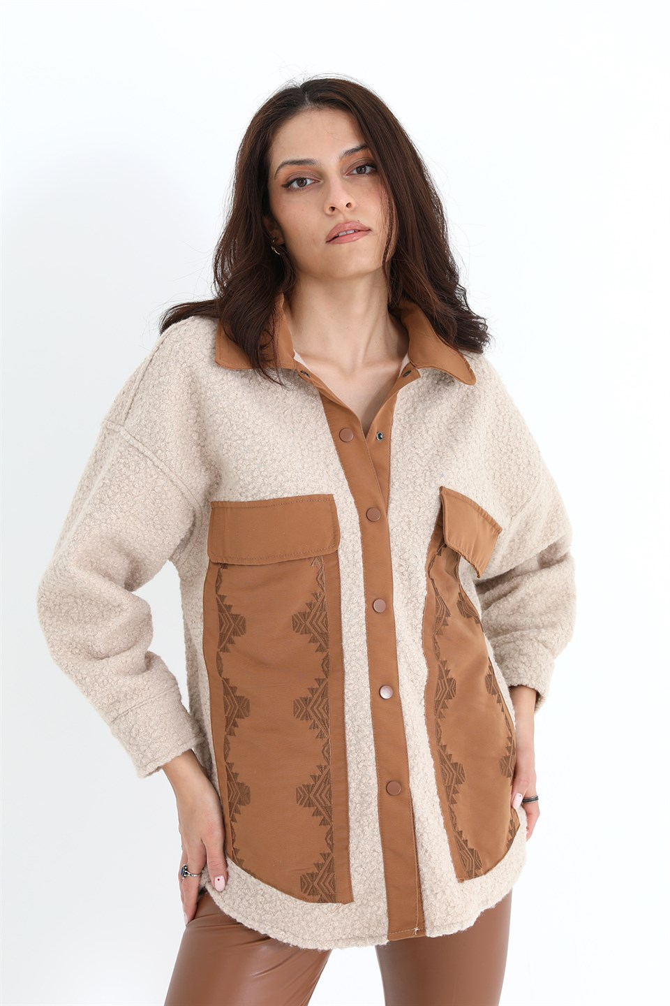 Çıtçıtlı Cep Nakışlı Bergamo Gömlek Ceket - Bej