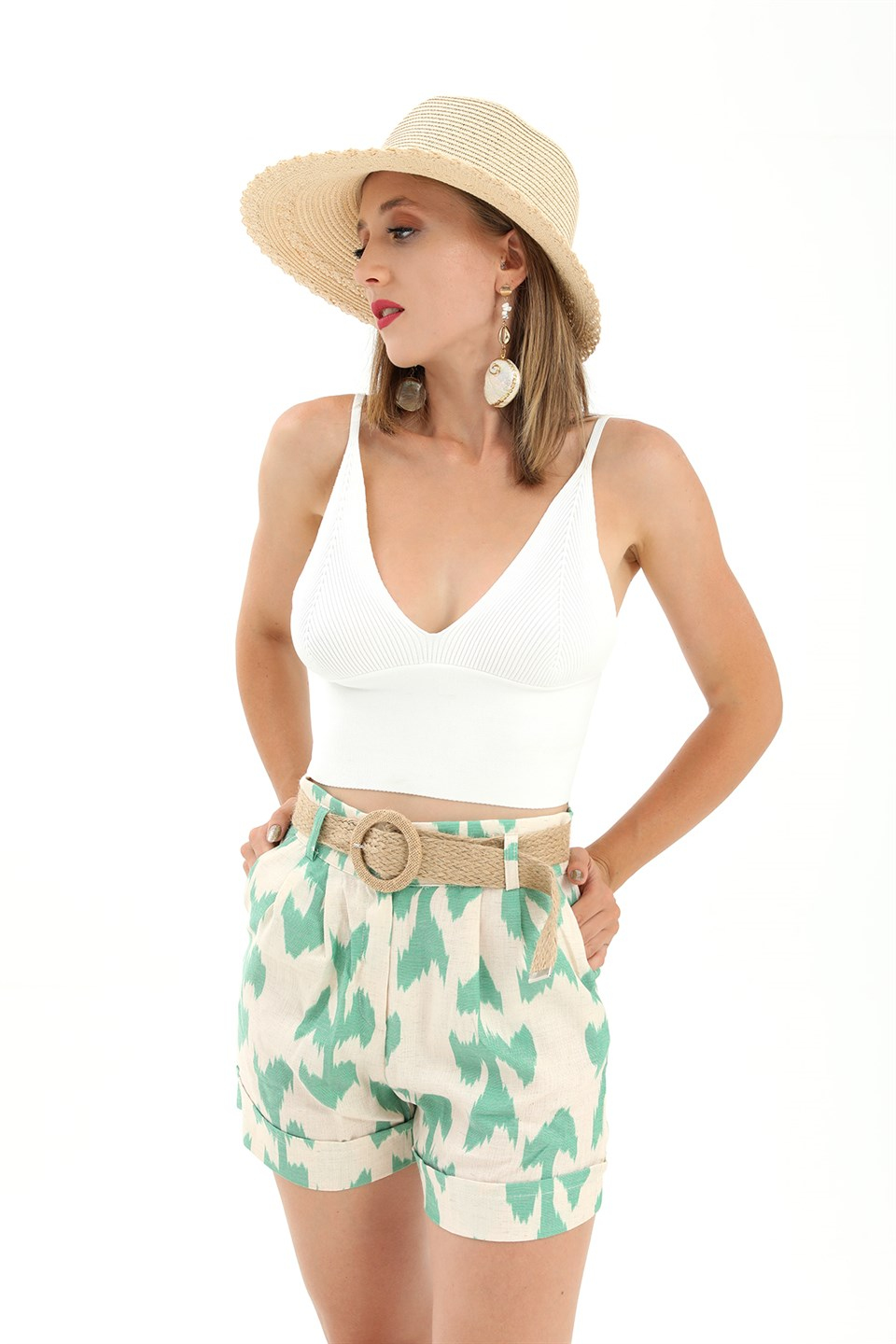 Hasır Kemer Baskılı Keten şort - Yeşil (20221140)