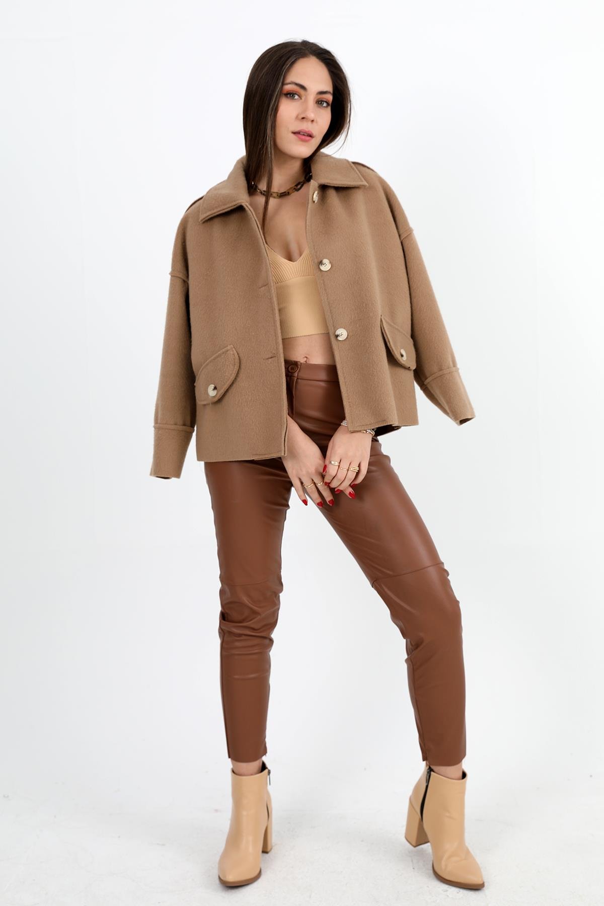 Kadın - Kaban Cep Kapaklı Düğmeli Kısa Kaşe - Camel